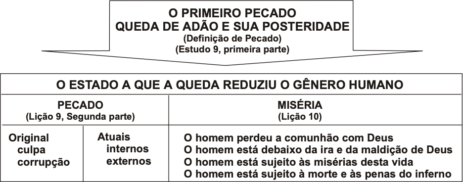Nas palavras do Breve Catecismo, e conforme estudamos anteriormente, “a queda reduziu o gênero humano a um estado de pecado e miséria… O estado de miséria consiste na culpa do primeiro pecado de Adão, na falta de retidão original, e na corrupção de toda a sua natureza, o que ordinariamente se chama pecado original, juntamente com todas as transgressões atuais que procedem dele” (respostas às perguntas 17 e 18). Nesta lição, vamos considerar “a miséria do estado em que o homem caiu”. O esquema abaixo resume todo este ensino do Breve Catecismo sobre o pecado, sua extensão e suas conseqüências.